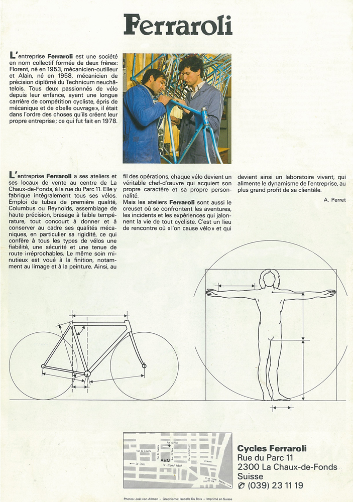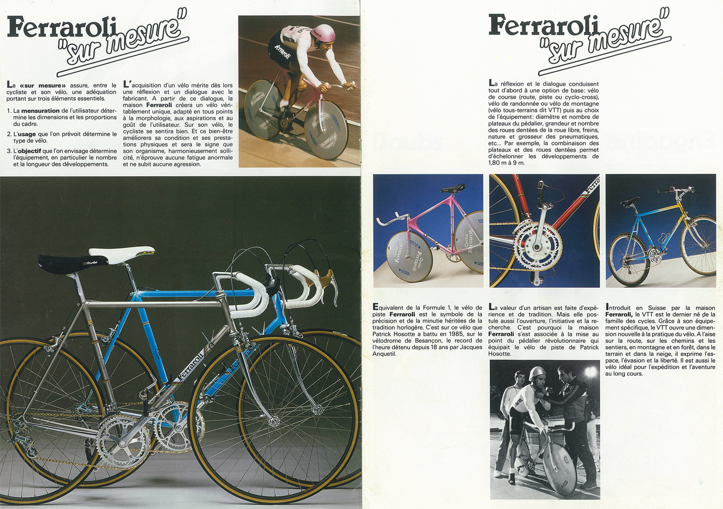 In the early to mid 1980s, during the infancy of Cycles Ferraroli SA, it appears that nearly all of their production was made-to-measure, or “sur mesure” in French. With each bike built to order for an individual, model names do not appear to have been used.