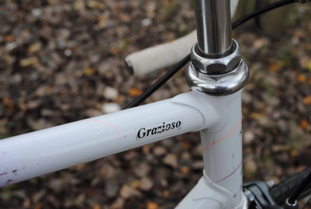 Pretty by name and pretty by nature, it is hard to visually distinguish the wishbone equipped Grazioso frames from Elegantes, unless you have the benefit of the tubing sticker, the fork, or a scale. It is even more difficult to understand what differentiates a Grazioso from a Simpatico, as they share the Tange Infinity tube set and fully sloping fork crowns. Until I can inspect more of these models in person, it is tough to be certain of their sizing and country of brazing, but it is clear that like all Ferrarolis, they were painted and assembled in Switzerland.
