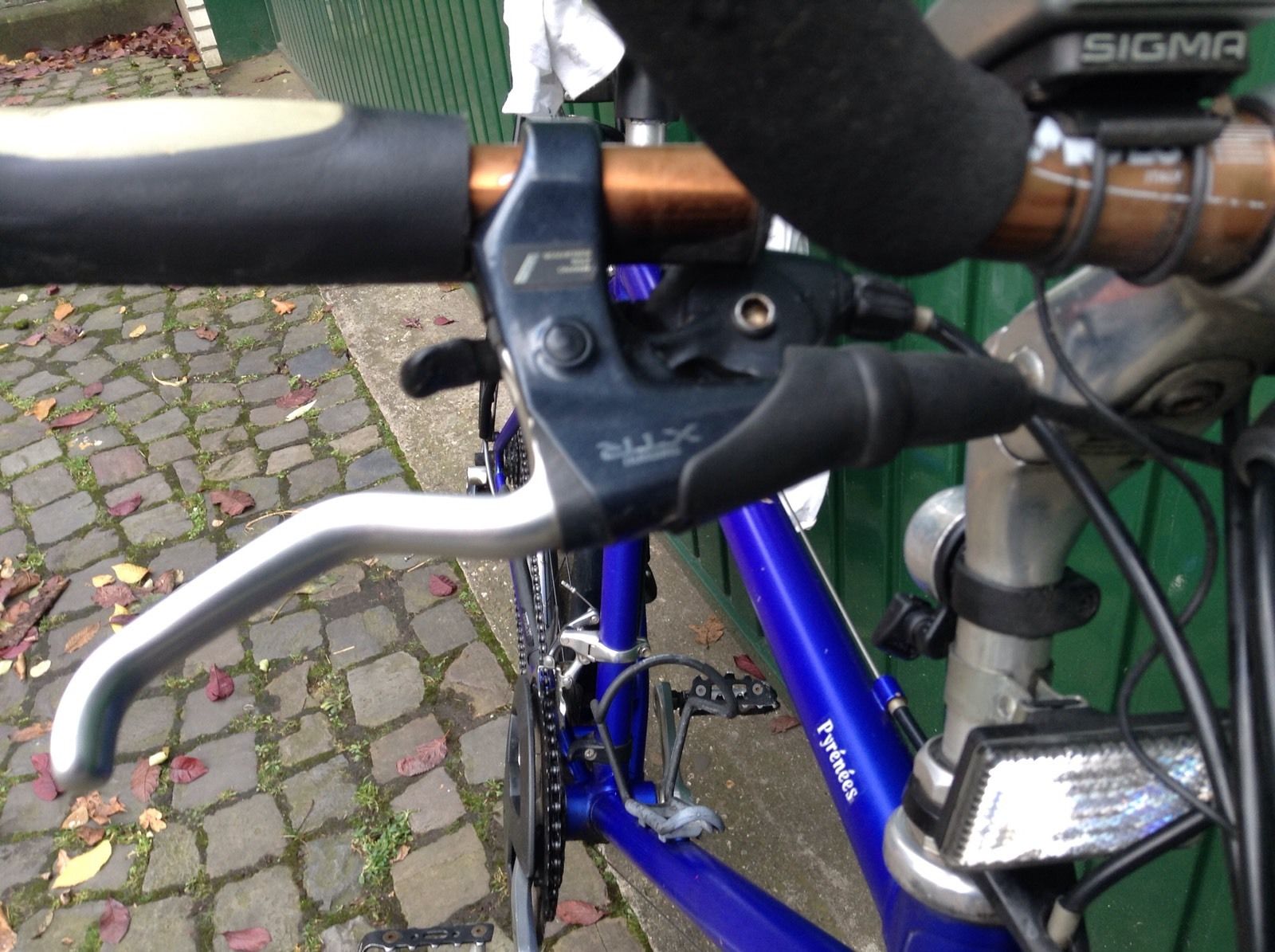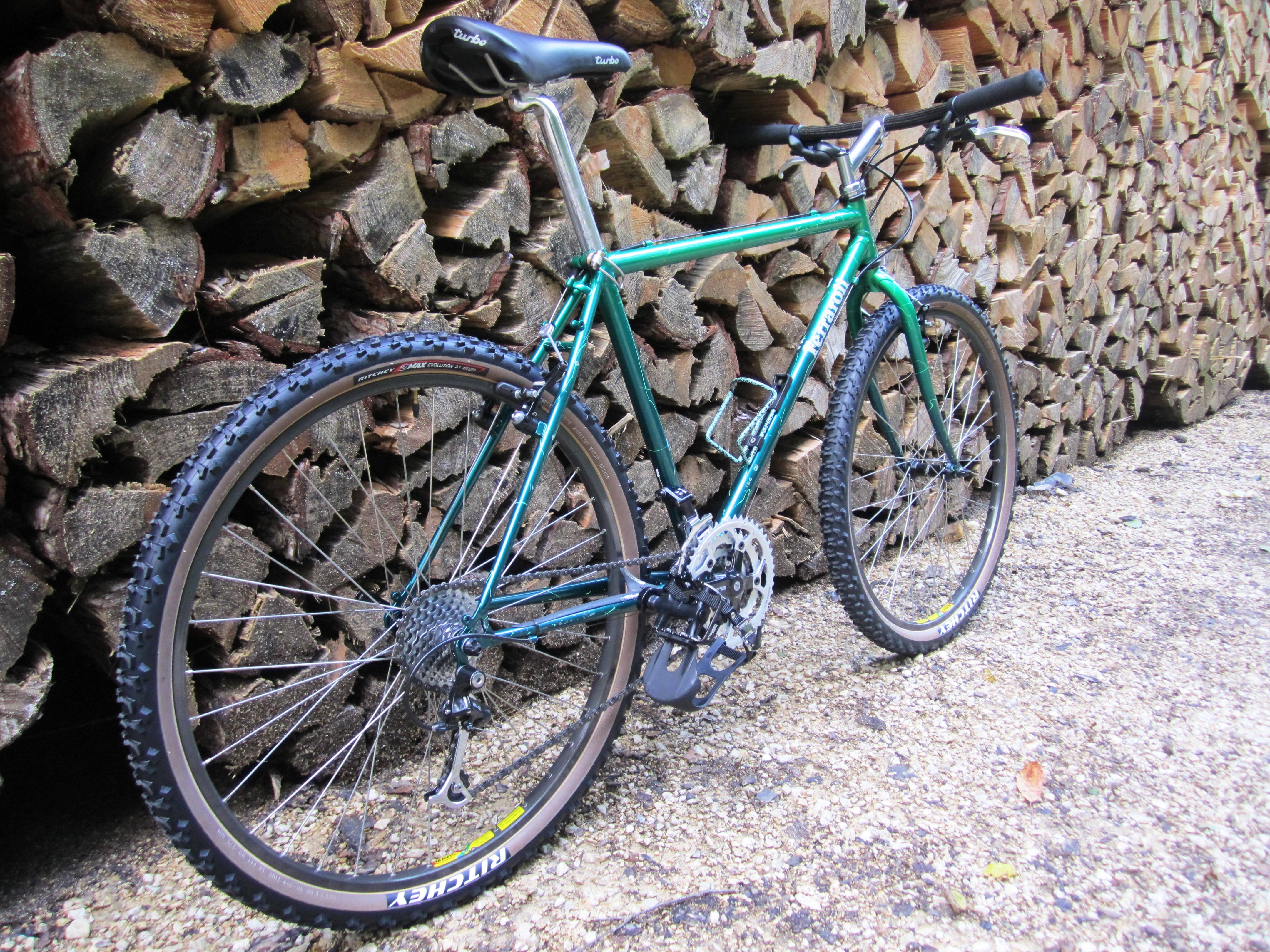 Etna, the Sicilian stratovolcanic mountain, was the name used for the middle specification in the 1990s family of prêt à porter mountain bike models. My Etna appears to have been built with a painted to match RockShox fork, but most were likely delivered with a lugged, flat-crowned, rigid fork typical of the Ferraroli brand, as seen in the second picture. All Etnas were sized off-the-rack, brazed in Japan, then painted and assembled in Switzerland.