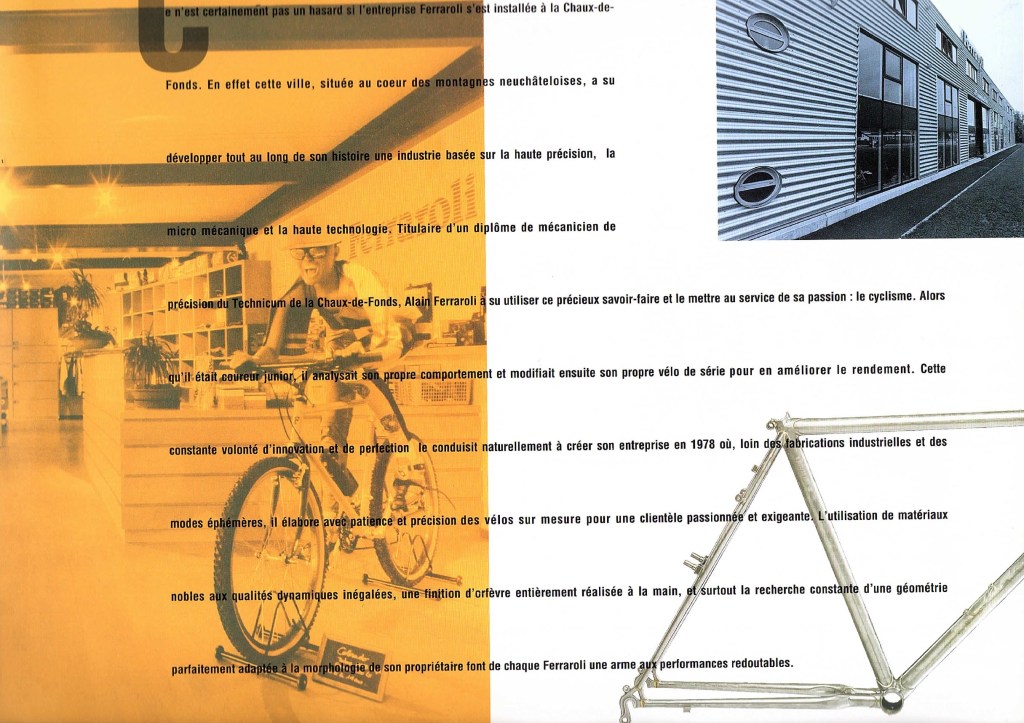 I have pictures taken in 1989 from the Ferraroli shop showing production, paint-box, and Alain doing the assembly of my bike. In addition I have the original measure-chart he did according to my body and how the frame should be. Finally I have pictures of today (2020), training on my Ferraroli together with my son. If you are interested, please let me know.