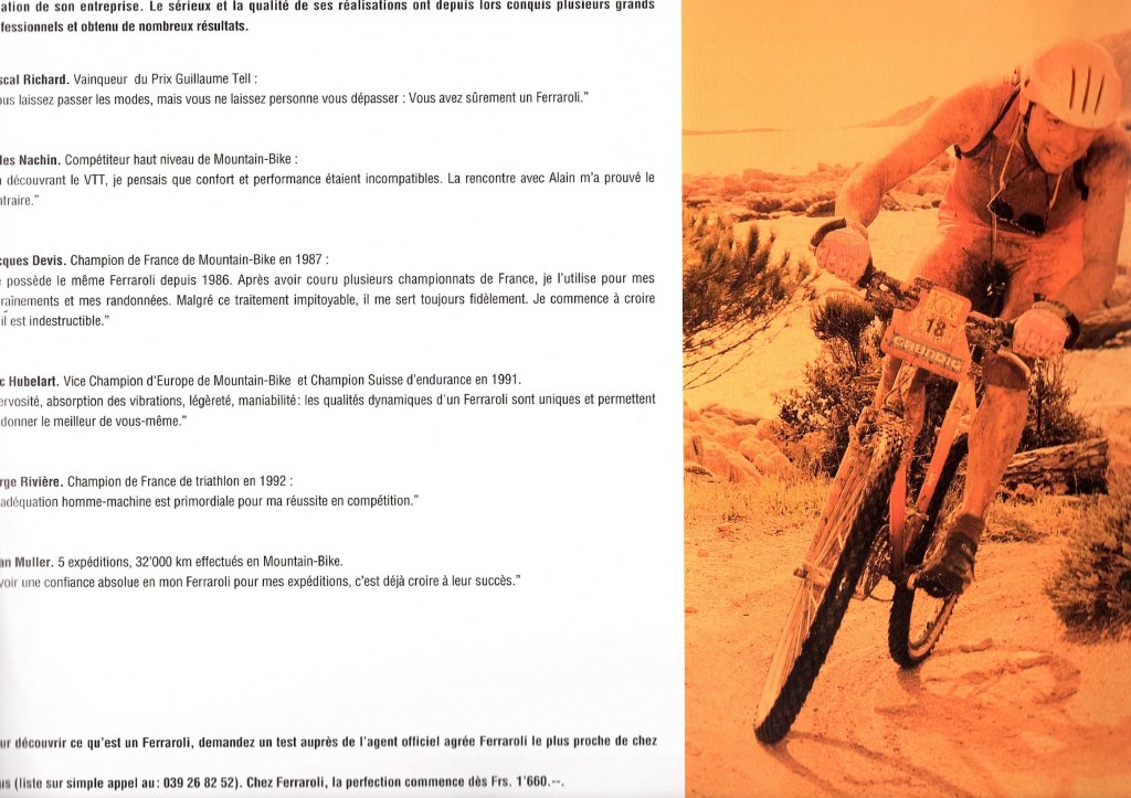 In 1989 I was 19 years old, and I had a 3 month stay in the Jura mountains. The family I lived with were into Cycling and let Alain Ferraroli build a road bike «sur mesure» to me. Since then I have enjoyed bicycling, both road and mountain.